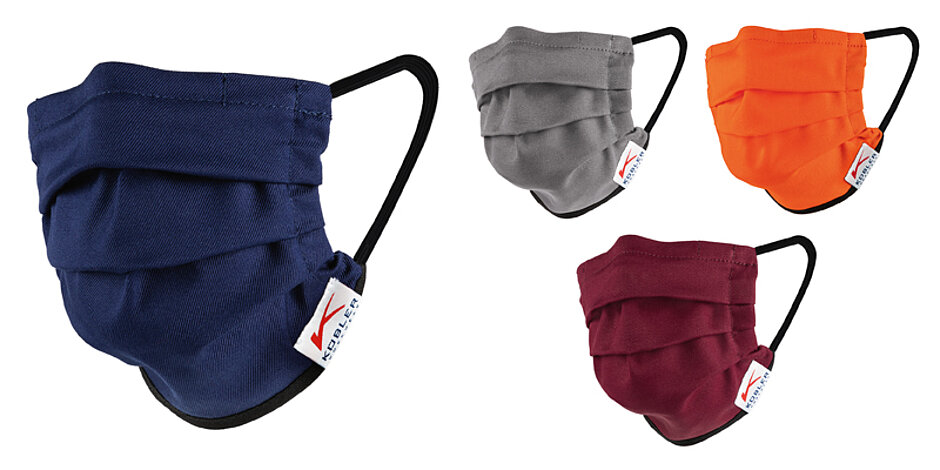 Das aktuelle Angebot umfasst Modelle mit Gummiband und zum Binden in den Farben Bordeaux, Marine, Mittelgrau und Orange. Die eingesetzten Gewebe – 100 Prozent Baumwolle oder Baumwoll-Polyester-Mischungen – sind für eine Wäsche mit 90 °C ausgelegt. Um die Masken individuell an die Gesichtsform anpassen zu können, verfügen sie über drei Falten und einen eingearbeiteten, formbaren Nasenbügel.