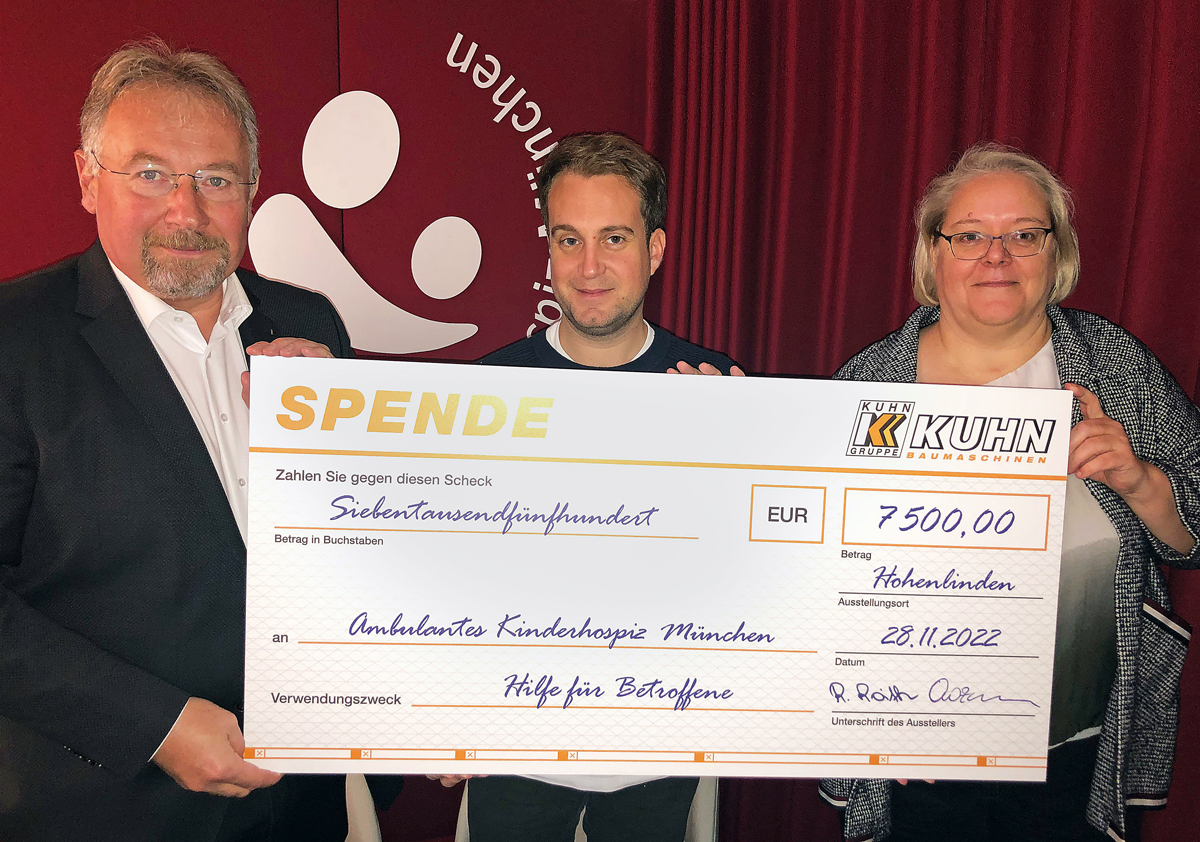 Die Stiftung Ambulantes Kinderhospiz München betreut Familien mit unheilbar kranken und lebensbedrohlich schwerkranken Ungeborenen, Neugeborenen, Kleinkindern, Kindern, Jugendlichen und jungen Erwachsenen sowie auch schwerstkranke Eltern mit Minderjährigen im Haushalt. Die Stiftung muss sich zu über 70 % aus Spenden finanzieren. Der Geschäftsführung von Kuhn Baumaschinen Deutschland war es ein Anliegen, die Stiftung auch in diesem Jahr wieder aktiv zu unterstützen. t