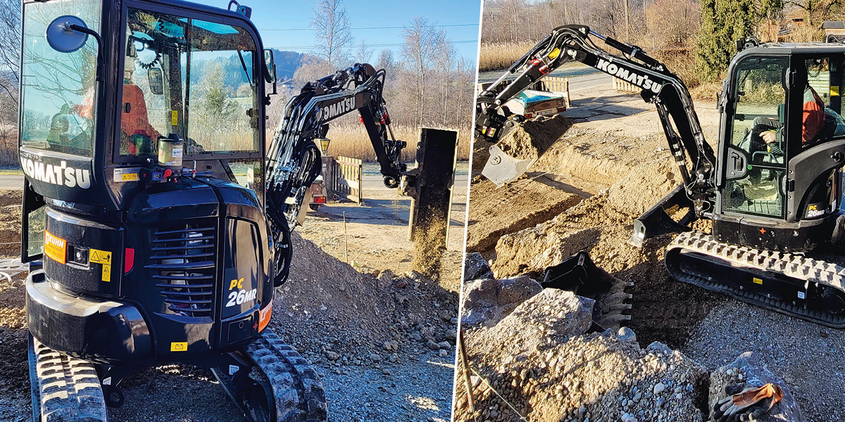 Dass der Komatsu Minibagger hinsichtlich Leistung, Effizienz und Kraftstoffverbrauch seine Ansprüche erfüllt, testete Vogl bei einer Maschinendemo auf dem Gelände von Kuhn Baumaschinen in Hohenlinden. Hier setzte sich der Komatsu PC26MR-5 durch, auch hinsichtlich Vielseitigeit und einfacher Handhabung.