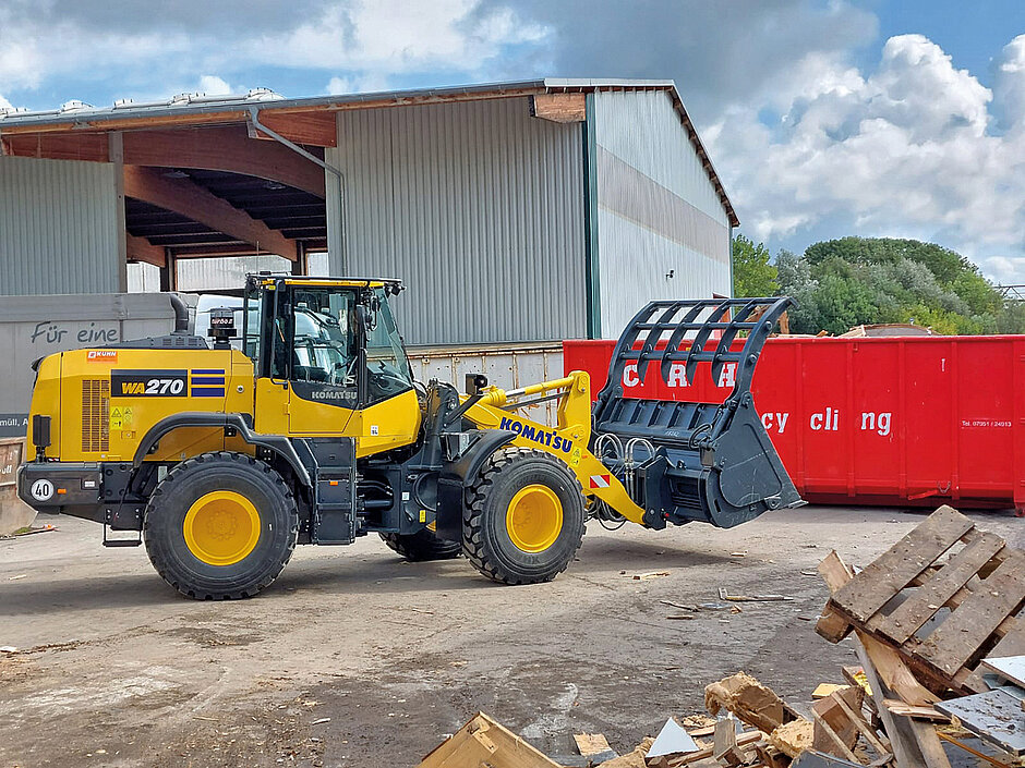 Auf dem Recyclinghof ist der Komatsu WA270-8 Highlift zum Aufladen, Umladen und Aufhalden von Recyclingmaterial wie Leichtstoffverpackungen (LVP), Kartonagen, Mischpapier, aber auch Baumischabfälle und Bauschutt täglich im Einsatz. Neben den ausgeschäumten Reifen und der Highlift-Ausführung mit einer Schaufel mit Niederhalter wurde in die Baumaschine eine zentrale Schmieranlage eingebaut. Mit den hohen Losbrechkräften der Maschine und einer guten Gewichtsverteilung bietet sich der WA270-8 Highlift für anspruchsvolle Einsätze im Recyclingbereich an.