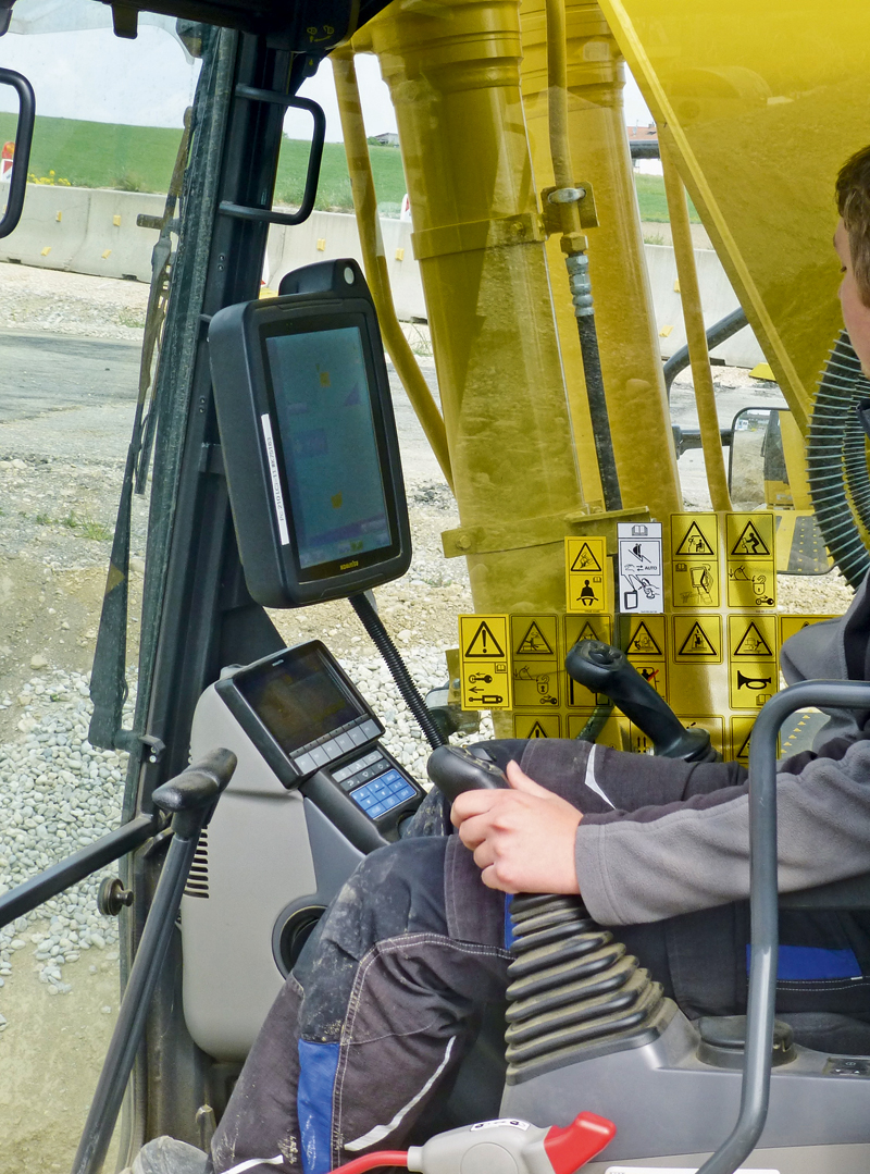 Dank der 3D-Monitordarstellung können Absteckarbeiten und die Nachkontrolle auf der Baustelle reduziert und die Sicherheit erhöht werden, da auf der Baustelle und in unmittelbarer Umgebung der Maschine weniger Personal benötigt wird. Ein-/Aus-Schalter für die halbautomatische Steuerung und für das Erhöhen oder Senken des Offsets sind jetzt vollständig in die Joysticks integriert. Das integrierte Internetmodem ermöglicht die Datenübertragung und Fernwartung.