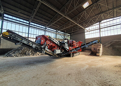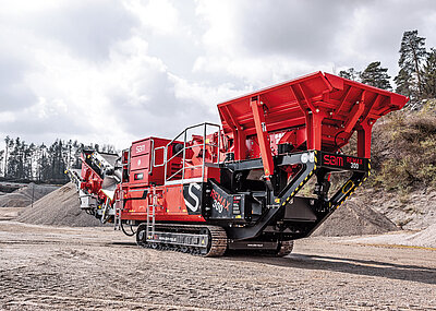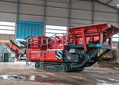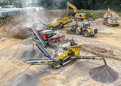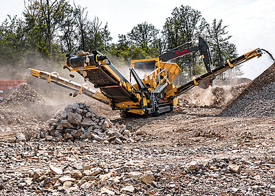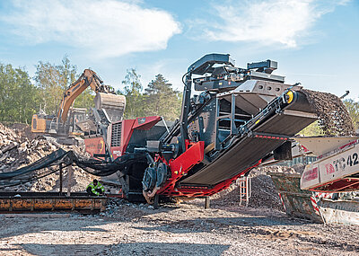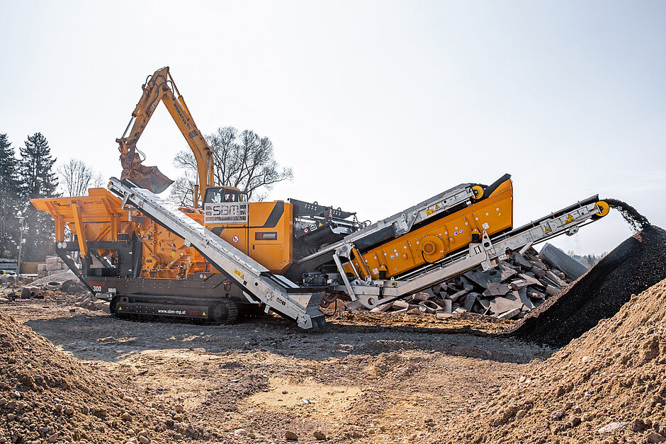 Im Einsatz ist u.a. die »SBM Remax 300«, eine mobile Prallmühle mit einer Einlauföffnung von 1 040 x 760 mm und einer Durchsatzleistung von bis zu 300 t pro Stunde. Der dieselelektrische Antrieb sorgt für hohe Effizienz, gleichzeitig ermöglicht die integrierte Plug-in-Technologie den Betrieb mit grünem PV-Strom. Ausgestattet mit Siebmodul, Windsichter, Magnetabscheider und Funkfernbedienung, eignet sich die Anlage ideal für mittelgroße bis große Anwendungen – sowohl mobil als auch stationär. Ergänzt wird das Set-up durch die »OM Track K5e«, eine vielseitige Schwerlast-Siebanlage mit einem Doppeldeck-Siebkasten und bis zu 450 t Durchsatz pro Stunde. Die robuste Ausführung mit Plattenbandaufgeber und hydraulisch klappbaren Bunkerwänden gewährleistet einen zuverlässigen Betrieb auch unter anspruchsvollen Bedingungen. Aufgrund dieselelektrischem Antriebs und PV-Kompatibilität passt sich die »K5e« flexibel an unterschiedliche Einsatzorte und Energieanforderungen an.