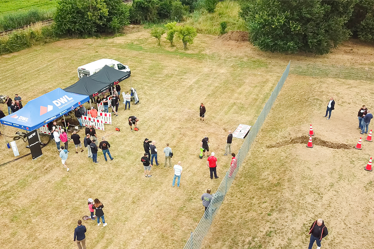 Aus einer spontanen Idee heraus fand am Freitagnachmittag ein Wettkampf zwischen der Schweiz und Deutschland statt. Gekämpft wurde um eine Spende für das Senegalkrankenhaus Bilbassi. Das Team von DWL Baumaschinen trat mit seiner Mini-Spülbohranlage, der MiniRockDrill, gegen das L-Team mit der Akku-Power-Horizontalbohranlage Drill-Vole 2.0 an zu einer 25 m Bohrung mit einem Höhenunterschied von ca. 1,80 m bergauf zum Zielpunkt. Es musste unter einer Pylone zielgenau getroffen und auf dem Rückzug aufgeweitet werden. Das Schweizer Team war bei der Pilotbohrung schneller im Ziel, der Räumer vom L-Team im Anschluss schneller wieder zurück in der Startgrube. So einigten sich beide Teams auf ein faires Unentschieden und spendeten im Anschluss am Stand von Bilbassi e.V. für das Kinderkrankenhaus.