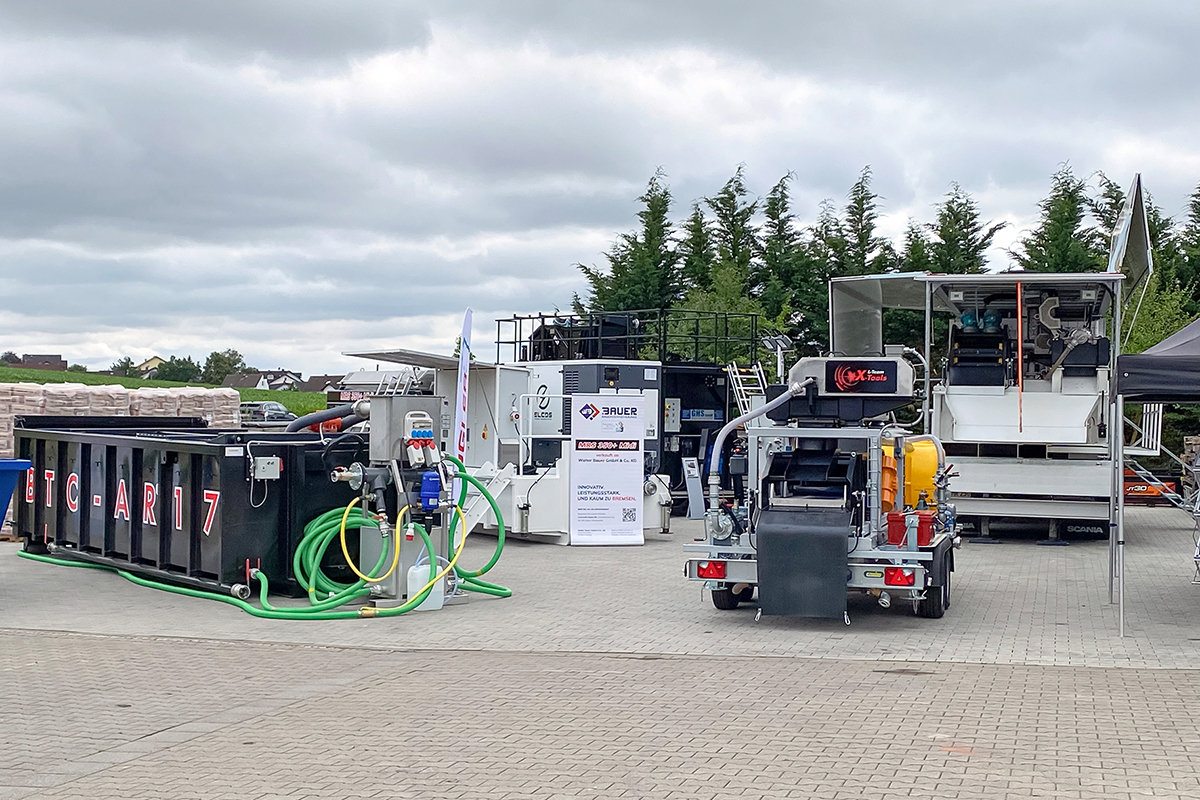 Das interessierte Fachpublikum konnte sich einen Eindruck aller drei verfügbaren Recyclergrößen verschaffen: MRS 150 Mini Trailer, eine Anhängerlösung für ein Zugfahrzeug bis 3,5 t, MRS 250 MidiFlex, eine Bentonit-Misch- und Recyclinganlage als „All-in-one“-Lösung verbaut in einem LKW, MRS 350+ Midi auf einem Hakenabrollcontainer für einen stationären oder mobilen Einsatz.
