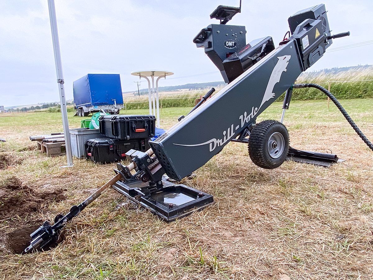 Die Drill-Vole 2.0, eine akkubetriebene Horizontalspülbohranlage von der Firma Dekena Maschinentechnik, war erneut im Einsatz zu sehen. Sie könne mit ihren kompakten Maßen, ihrer Leistungsstärke und geringer Lautstärke während des Einsatzes punkten. Sie eigne sich damit ideal zum Verlegen von Hausanschlüssen sowie für Straßenquerungen auf engstem Raum und verursacht keine Flurschäden. Außerdem zeichnet sie sich durch bohrbare Längen von bis zu 40 m, einer Akkulaufzeit bis zu 9 h, sehr kleine Biegeradien (8 m!), eine Zug- und Schubkraft von 750 kg, ein Drehmoment von 95 Nm sowie eine maximale Spindeldrehzahl von 220 U/min aus.