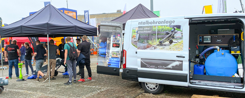 Großes Interesse weckte die erste akkubetriebene Horizontalbohranlage der Welt, Drill-Vole®, samt der dazugehörigen Bentonit-Mischanlage und Zubehör (kleines Werkregal, Räumerhalter, Gestängelagerfach, Seilwinde, Sandsäcke, Batteriesatz mit Spannungswandler) eingebaut in einen Transporter als selbstfahrende Arbeitsmaschine. So lassen sich ohne aufwendigen Auf- und Abbau alle Arbeitsgeräte schnell und bequem in einem Fahrzeug bis 3,5 t von einer zur anderen Baustelle transportieren. Durch den integrierten Batteriesatz arbeitet die Mischanlage autark. Ebenso können durch sie die Akkus der Bohranlage parallel während der Arbeit wieder aufgeladen werden.