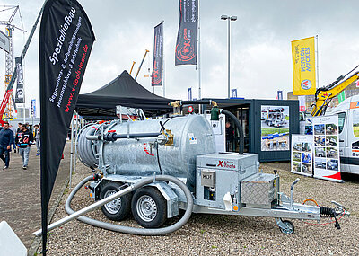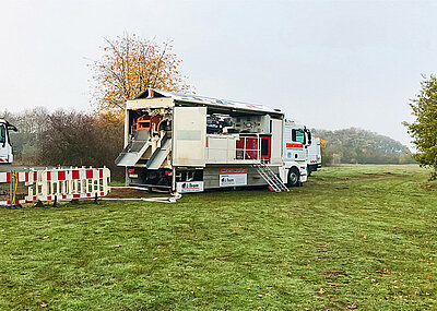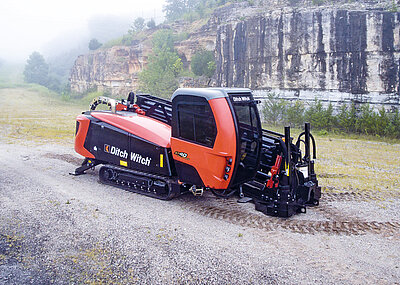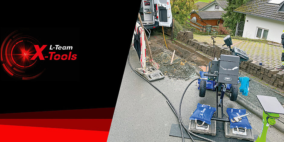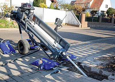 Die Bohrstrecke zum Haus hatte eine Länge von 28 m bei einem Winkel von 80° um die Hausecke herum. Zusätzliche Schwierigkeiten ergaben sich durch die Unterbohrung einer Gartenhütte, wodurch sechs bis sieben Meter im Zielbereich nicht zu orten waren, sowie den Höhenunterschied von sieben Metern von der Startgrube zur Zielgrube, bedingt durch die abschüssige Einfahrt zum Wohnhaus. Nach erfolgreicher Pilotbohrung wurde auf dem Rückzug mithilfe eines Räumers das Verbundrohr mit 35 mm Durchmesser direkt eingezogen. Trotz dieser Herausforderungen hat die Firma L-Team X-Tools diesen Auftrag innerhalb von 3,5 h inklusive Auf- und Abbau erfüllt. Bei der zweiten Bohrung am selben Tag war die besondere Herausforderung unter anderem das Umbohren etlicher Fremdleitungen, die ein zusätzliches Hindernis darstellten. Es wurde eine V-Straßenkreuzung im Bogen durchbohrt, um zwei Zuleitungen für die Straßenanbindung zu verlegen. Auch diese Bohrung war dank Drill-Vole 2.0 Power-Akku-Bohranlage möglich, da sie selbst bei einem sehr kleinen Biegeradius von nur 8 m Straßenquerungen bohren und Fremdleitungen umgehen kann.d