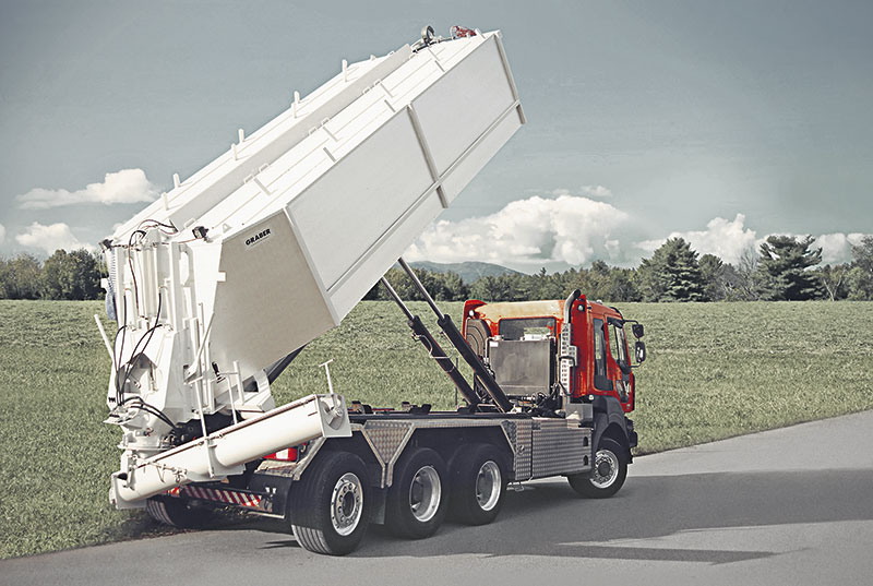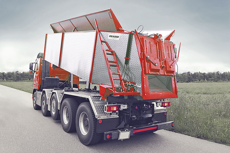 Das Thermosilo wird von Graber auf ein beliebiges Kundenträgerfahrzeug mit Kippmöglichkeit aufgebaut – für Kipperbrücke, Abrollkipper, Absetzkipper, Wechselsystem oder einen Festaufbau. Die zum Einsatz kommende Leichtbauweise ermöglicht dabei besonders hohe Nutzlasten. Der große Auslaufschieber, und auf Wunsch auch die Einfülldeckel, lassen sich von der Fahrerhauskabine oder direkt vom Heck aus bedienen. Für den Handeinbau stehen zwei Handschieber zur Verfügung, mit denen dosiergenau eine Schubkarre befüllt werden kann. Die Vollisolation des Thermosilos gewährleistet eine längst mögliche Warmhaltung des Heißmischguts und die spezielle Bauform hilft zudem, im Gegensatz zu einer Asphalt-Birne, eine geringstmögliche Entmischung des Asphaltmischguts zu garantieren. Als weiterer wichtiger Produktvorteil gilt die Graber-Doppelkammeroption, um zwei verschiedene Asphaltmischsorten (Trag- und Deckschicht) transportieren zu können oder die Möglichkeit eine hydraulisch angetriebene Verteilschnecke anzubringen und damit kräfteschonend und punktgenau das Heißmischgut verteilen zu können.
