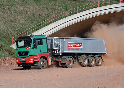 Geeignet für den schweren Einsatz im Abbruch oder zum Transport von Wasserbausteinen sind die Sattelkipper mit Stahl-Halbschalenmulde auch für leichten Aushub oder zur schweren Schuttbeförderung einsetzbar. Die Wand- und Bodenstärken variieren dabei je nach Anforderung des Kunden, Stahl-Halbschalen von Langendorf können mit einer individuellen Materialstärke hergestellt werden.