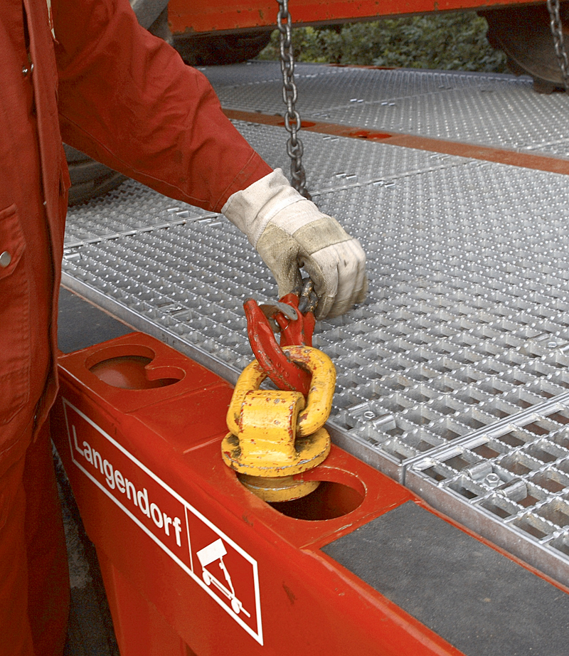 Oft sind die festen Zurrpunkte bei Tiefbett-Tiefladern nicht an den Stellen, wo sie gerade benötigt werden. Manchmal verdeckt die Ladung die Zurrpunkte, in anderen Fällen sind die Zurrwinkel zu klein oder das Sicherungsmittel, in der Regel Schwerlastketten, beschädigt die Ladung. Um diese Probleme beim Verzurren weitestgehend zu verhindern, bietet Langendorf das Vario-Lash-System mit einem optimalen Zurrwinkel samt 10 000 daN an.