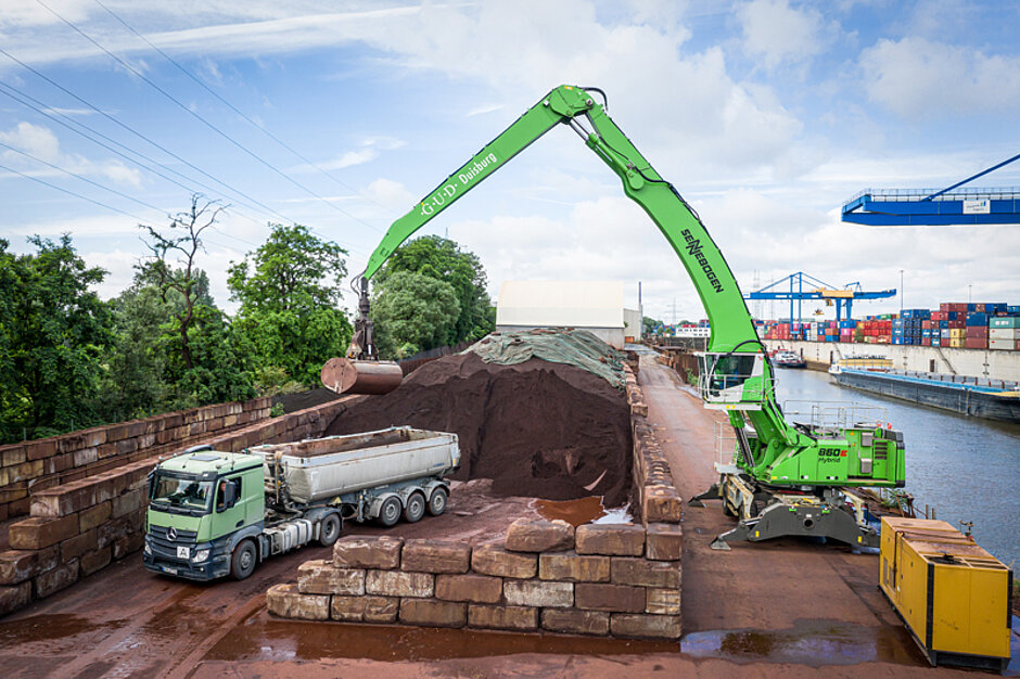 Ein weiterer Umschlagbagger ist seit vielen Jahren zuverlässig bei GUD in Betrieb: Ein 825 der D-Serie aus dem Jahr 2016 übernimmt die Zwischenlagerung von Eisenoxid in einer überdachten Halle. Er hat mittlerweile ebenfalls 7.000 Betriebsstunden am Zähler und verrichtet seine Aufgaben zuverlässig und schnell. Andreas Frye erläutert weiter, wie wichtig ihm beherrschbare Technik und die Nähe zu seinen Ansprechpartnern ist: „Durchweg genießen wir den guten Service durch unseren Partner BRR, aber auch die Verbundenheit zu SENNEBOGEN selbst liegt uns am Herzen. Die Maschinen sind immer auf einem technisch sehr guten Stand und nicht mit Elektronik überfrachtet: das bedeutet auch, dass wir Servicearbeiten teilweise selbst vornehmen. So gelingt es uns, die Maschinenverfügbarkeit dauerhaft hoch zu halten.“
