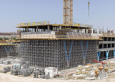 Die Montage selbst vergab HOCHTIEF an ein professionelles Gerüstbauunternehmen, die Muehlhan Deutschland GmbH. Die Zusammenarbeit mit Gerüstbauunternehmen bei Auf- und Abbau kann entscheidend zur Erhöhung der Effizienz auf der Baustelle beitragen. Die qualifizierten und erfahrenen Spezialisten montieren deutlich schneller als beispielsweise Subunternehmer ohne Gerüstbauerfahrung. Ist zusätzliches Material erforderlich, kann dies projektbezogen beim Gerüstbauer angemietet werden. Mit dem vorhandenen Layher Materialbestand lassen sich außerdem viele weitere Aufgaben rund um die Baustelle lösen. Das Leistungsspektrum reicht vom klassischen Fassadengerüst über Treppentürme und Überbrückungen bis hin zu Betonier- und Bewehrungsgerüsten sowie Baustellenschutz. Dazu zählen temporäre Überdachungen ebenso wie Einhausungen. Bundesweit gibt es ein dichtes Netz an Layher Gerüstbaukunden. Der Layher Berater vor Ort vermittelt den passenden Kontakt.