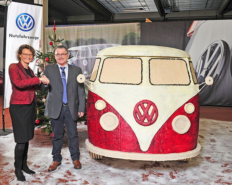 Dr. Elke Eller, Personalvorstand Volkswagen Nutzfahrzeuge: »Es macht gleich dreifach Freude, diesen Lebkuchen-Bulli ersteigert zu haben: Einerseits helfen wir mit dem Erlös krebskranken Kindern. Zum anderen schmückt er auch unsere Oldtimer Bulli-Werkstatt in der Weihnachtszeit. Anschließend werden wir diesen Bulli der betriebsnahen Kita schenken, die in Kürze eröffnet wird.« Da der Bulli aus Holz ist, kann er aufgesägt und innen als Spiel- und Kuschelbulli ausgebaut werden. Den Umbau übernimmt Volkswagen Nutzfahrzeuge. Nimmt man die Lebkuchen ab, kann der Bulli von den Kindern sogar bemalt werden.