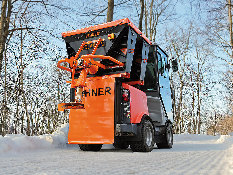 Der »Polaro M« eignet sich speziell für kleinere Träger-Fahrzeuge, deren Traglast z. B. auf ca. 450 kg limitiert ist. Fahrzeuge wie Kehrmaschinen können so dann auch im Winterdienst eingesetzt werden. Eine Förderschnecke im Behälter des »Polaro M« sorgt für einen konstanten Materialfluss. Ist der Nachfluss blockiert, schaltet sich bei Bedarf automatisch der serienmäßige Rüttler zu und lockert das Streugut im Behälter auf, damit es wieder nachfließen kann.