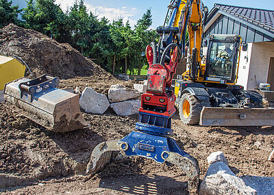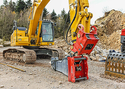 Bei der Verwendung von vollhydraulischen Variolock-Schnellwechselsystemen kann der Baggerführer im Handumdrehen vom Tieflöffel zum Hydraulikhammer wechseln. Damit ist schnelles und effizientes Arbeiten auch in Gewinnungsbetrieben gesichert. §