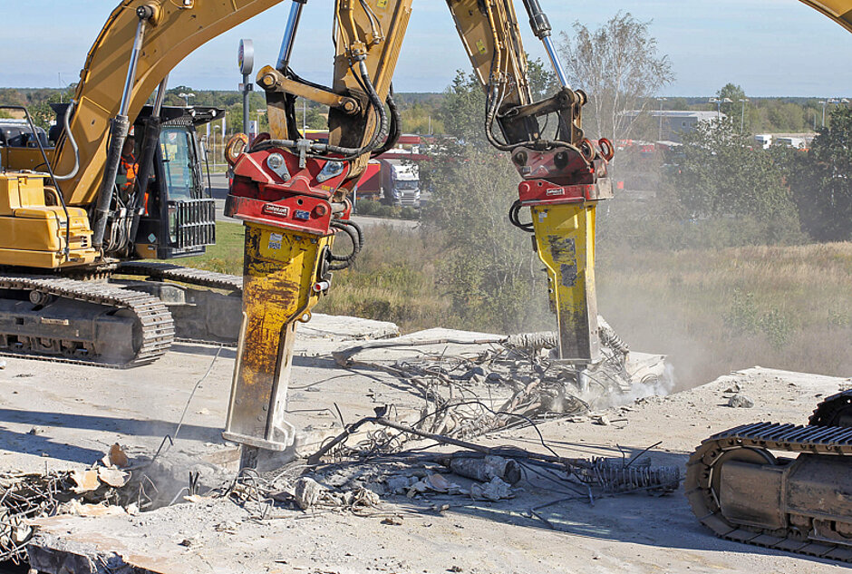 Die größte Zeitersparnis besteht darin, dass ein Baggerfahrer für den Tausch des Anbaugerätes nicht seinen Arbeitsplatz in der Kabine verlassen muss – selbst wenn kein Kollege beim Wechselvorgang Hilfestellung leistet. Davon hat auch Abbruch Büchert beim Rückbau einer Stahlverbundbrücke, die die Autobahn A 10 quert, profitiert. »Ohne vollhydraulische Schnellwechsler wäre das Vorhaben in der vorgegebenen Zeit nicht zu schaffen gewesen«, so Geschäftsführer Martin Büchert.