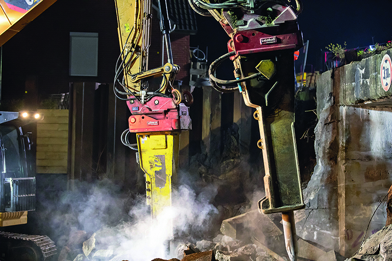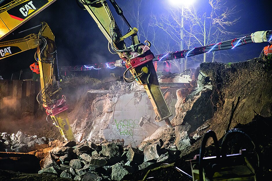 Das Variolock-System von Lehnhoff sorgte für einen schnellen, reibungslosen und sicheren Wechsel der Anbaugeräte. Wenige Minuten später erklang das charakteristische Klopfen, als würden stählerne »Riesenspechte« ihre »Schnäbel« in den Baukörper der Brücke treiben. Der Beton brach, Baggerketten quietschten beim Anlauf und Zurücksetzen, es krachte und malmte auf dem unebenen Untergrund.