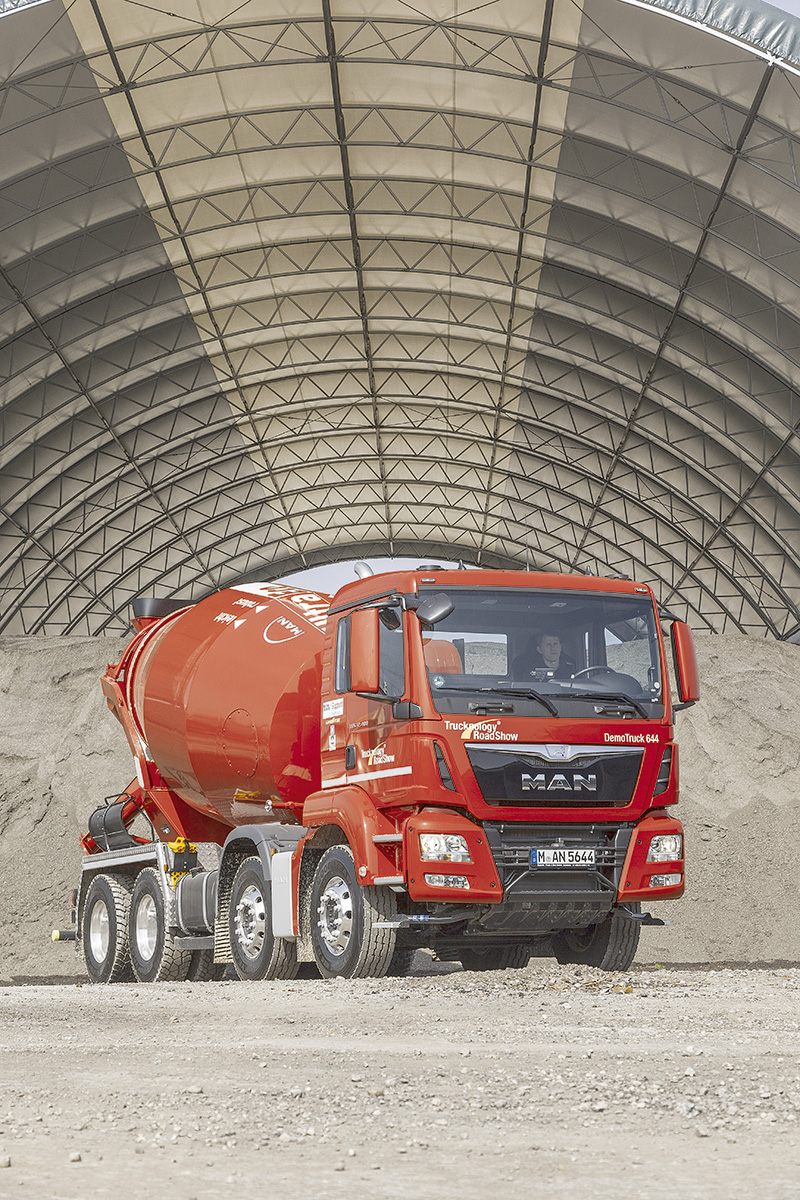 Wer am Tag mehr Beton ausliefert, macht mehr Umsatz und Gewinn. Nicht mit schnellerer Umlaufzeit, sondern mit ca. 0,5 m³ mehr Ladung je Tour ist das zu machen. Das 4-achsige MAN-Modell TGS 32.400 erfüllt genau die Anforderungen der Branche: Ein gewichtsoptimierter Rahmen aus hochfestem Stahl, ein leichter aber durchzugsstarker Motor mit 400 PS aus der D26-Common-Rail-Baureihe in Kombination mit dem automatisierten MAN-Getriebe TipMatic, Radstand von 2 505 mm zwischen der 2. und 3. Achse für kompakte Fahrzeugabmessungen und optimaler Wendigkeit im Stadtverkehr und auf der Baustelle, rundum einheitliche Bereifung im Format 315/80 R 22,5 auf Alufelgen, Tanks für 300 l Diesel und 3 l Adblue, das geräumige und übersichtliche M-Fahrerhaus sowie die hinter der Kabine teilhochgestellte Euro-6-Abgasanlage. Diese Anordnung vermindert Staubaufwirbelungen durch den Abgasstrom auf der Baustelle. So kommt das Fahrgestell auf etwa 9 360 kg Leergewicht ohne Tankfüllung. Je nach Hersteller des für 9 m³ ausgelegten Fahrmischeraufbaus, gefüllten Tanks mit Diesel, Adblue und 300 l Wasser sowie Fahrer bleibt exakt die Nutzlast für 8 m³ Beton, um das zulässige Gesamtgewicht von 32 t einzuhalten. Die im automatisierten Getriebe MAN TipMatic enthaltene Funktion Idle Speed Driving nutzt das hohe Drehmoment des Motors bei niedrigsten Drehzahlen und macht langsames Rollen komfortabler und Kraftstoff sparender.