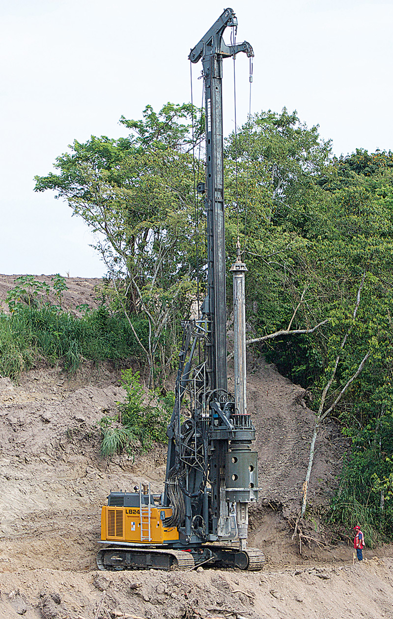 Laut Pedro Gregorio sind die Bodenverhältnisse entlang der Strecke unterschiedlich. Der Untergrund besteht jedoch vorrangig aus lockerem Fels, vor allem im Bereich der Flussquerungen, wo die meisten Brücken gebaut werden. »Aus diesem Grund haben wir die Verrohrungsmaschine erworben. Wir bohren bis in eine Tiefe von 37 m bei Pfahldurchmessern von 1,5 m, 1,2 m und 1 m. Diese lockeren Flussfelsen finden sich bis in Tiefen von 20 m bis 30 m und haben keine Bindung. Ohne Verwendung eines Bohrrohres würde das Bohrloch leicht einbrechen. Aus diesem Grund verwenden wir beim Abbohren die Verrohrungsmaschine zum Einbringen der Bohrrohre in 3-m-Abschnitten.«