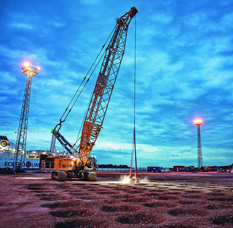 „Große Flächen entstanden hier durch Landgewinnung, deshalb ist der Boden sehr weich und muss gut verdichtet werden«, erklärt Johanna Takanen, die heute zusammen mit ihrem Bruder Juha das vom Vater Martti in den 1970er-Jahren gegründete Erdbewegungsunternehmen leitet. Das Unternehmen Takanen verwendet für die Baumaßnahme den Liebherr-Seilbagger HS 8130 HD mit einem Fallgewicht von 14 t. Das Gewicht wurde im freien Fall aus 10 m Höhe auf den zu verdichtenden Baugrund fallen gelassen. Der so erreichte »Impact« betrug 50 kN/m² bis 70 kN/m² und verdichtete den Untergrund bis 7 m Tiefe. Pro Stunde schlug das Gewicht 110 mal auf den Boden auf, im gesamten Projektabschnitt rund 50 000 mal.