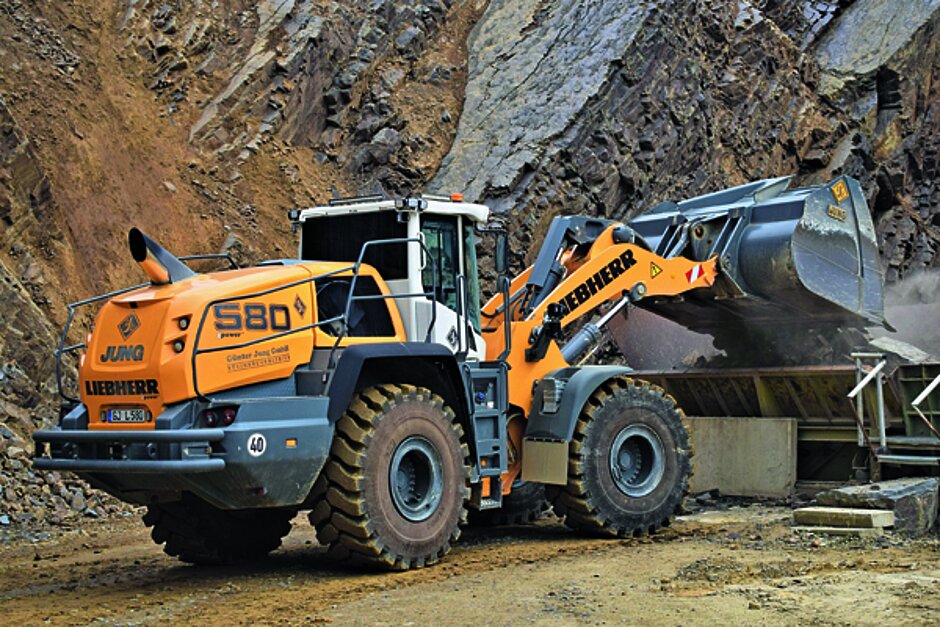 Das Spezialgebiet des Unternehmens von Günter Jung ist die Gewinnung von Grauwacke und deren Weiterverarbeitung. Der Steinbruchbetrieb produziert Schüttgüter unterschiedlicher Güteklassen, etwa für den Spezialtiefbau. Die hochqualitativen Bruchsteine, Bruchsteinplatten, Zier- und Quadersteine finden im Hochbau sowie im Garten- und Landschaftsbau Verwendung. Der Liebherr-Radlader L 580 XPower übernimmt bei der Gewinnung und Verarbeitung dieser Produkte eine Schlüsselrolle im Steinbruch. Er nimmt das gesprengte Material an der Abbruchwand auf und transportiert es zu den beiden Brechanlagen. Dabei legt er einfach eine Wegstrecke von rund 100 m zurück. Mit seinem leistungsverzweigten Fahrantrieb meistert der rund 28 t schwere Radlader diese Strecke, auf der sich ein rund 15 m langes Steilstück befindet, mit Leichtigkeit. »Der XPower-Fahrantrieb des L 580 überzeugt mich auf ganzer Linie. In unserem Steinbruch befindet sich eine steile Rampe. Sogar hier zieht die Maschine voll durch«, betont Günter Jung