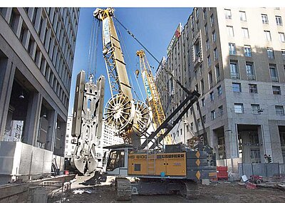 Beim Einsatz in Zürich führt der Hydroseilbagger Schlitzwandarbeiten im Greiferverfahren durch. Die Schlitzwand ist 600 mm dick und 25 m tief. Bei der Erstellung bewegt sich der Greifer teilweise in einem Abstand von nur 20 cm von der Fassade der denkmalgeschützten Gebäude. Das erfordert höchste Genauigkeit von Mensch und Maschine. Das Liebherr-Gerät beweist jedoch eindrucksvoll seine Verlässlichkeit und Präzision. »Der Geräteführer ist mit dem Handling des HS 8100 HD sehr zufrieden«, ergänzt Bucher. Nach Aushub der Schlitzwände wird mithilfe des Seilbaggers die Bewehrung eingesetzt.