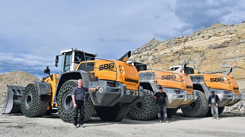 Der geringe Kraftstoffverbrauch ist besonders bemerkenswert, weil die über 33 t schweren Radlader über diverse Sonderausstattungen für den Gewinnungseinsatz verfügen. Vor allem die Reifenschutzketten sind markant, die je nach Ausführung pro Stück bis zu 800 kg wiegen. In Kombination mit den automatisch wirkenden Selbstsperrdifferenzialen der Radlader dienen sie vorwiegend der besseren Traktion. »Der Kalksteinboden in unseren Steinbrüchen, der vor allem nach Regentagen schlammig und rutschig ist, macht die Reifenschutzketten erforderlich«, erläutert Wilhelm Rinsche.