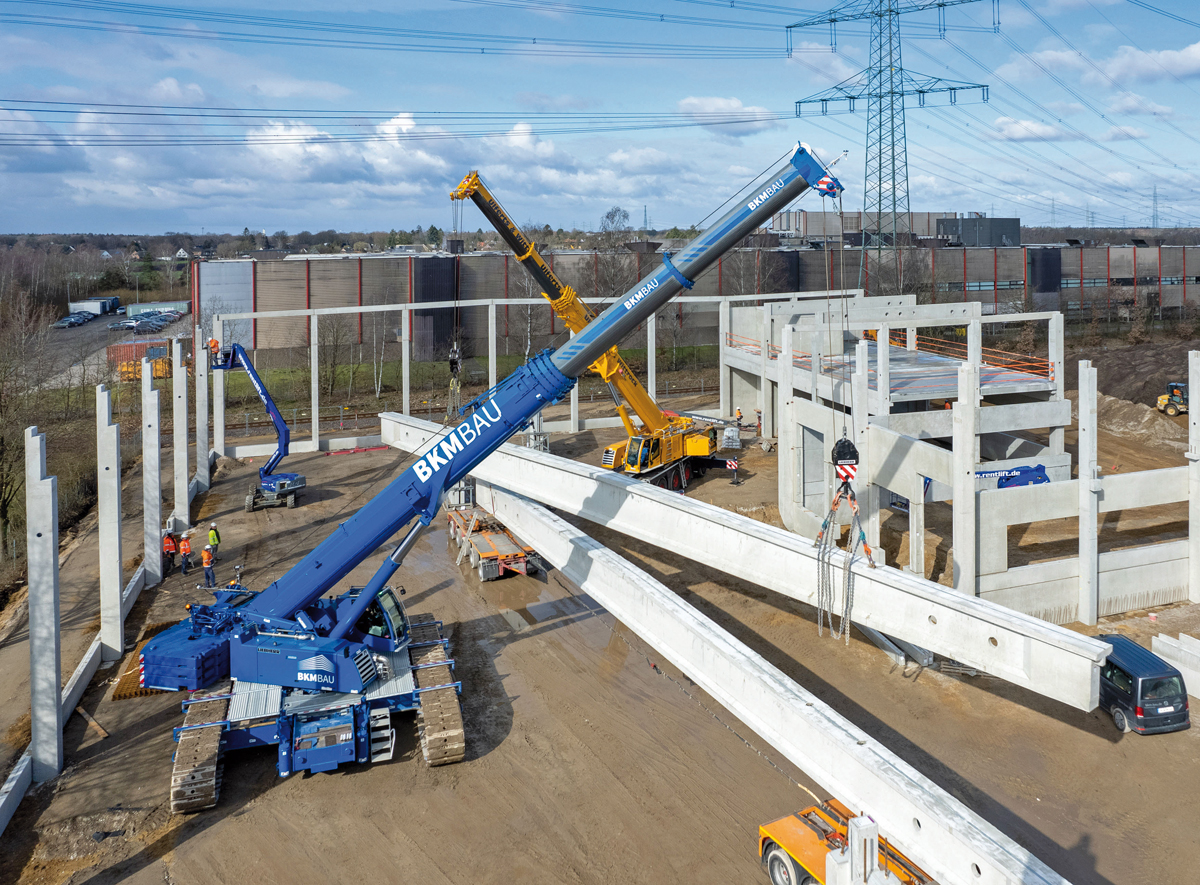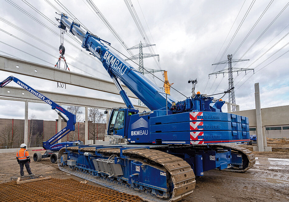 Das Unternehmen BKM ist Anbieter von Betonfertigteil-Gebäuden mit mehreren Standorten zur Produktion der Stahlbeton-Elemente. Bislang hat die in Nienburg zwischen Hannover und Bremen ansässige Firma die Lagerhallen oder Bürogebäude für ihre Kunden mit Mobilkranen aufgestellt. Seit einem Jahr nun arbeitet zusätzlich ein Teleskopausleger-Raupenkran von Liebherr die Aufträge ab – mit beachtlichem Erfolg: »Wir sind mit unserem neuen LTR 1220 deutlich schneller als bisher. Mindestens um 20 %«, erklärt Boris Cordes. Er ist unter anderem Montageleiter bei BKM und hat auch das letzte große Projekt des Raupenkrans in Norderstedt bei Hamburg betreut.