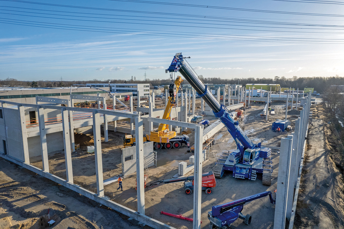 Der LTR 1220, die nach Angaben des Herstellers mit Abstand hubstärkste Maschine auf dem Markt der Raupenkrane mit Teleskopausleger, konnte in Norderstedt jedoch nicht nur seine beträchtliche Power, sondern auch weitere Fähigkeiten zur Geltung bringen: Die Montagen von 36 m langen Dachbindern unter der Stromleitung waren die Knackpunkte auf der Baustelle. Weil sämtliche Pfeiler der Halle zu Projektbeginn gesetzt worden waren, konnten die Träger nicht parallel zur Einbaurichtung angeliefert werden. Dem auch unter Last mobilen Raupenkran kam die Aufgabe zu, das entfernt liegende Ende der 40 t schweren Elemente zu packen und mit der Last unter die Freileitung zu fahren. Auf der anderen Seite hatte ein Liebherr-Mobilkran angeschlagen und schwenkte die schweren Riegel aus Stahlbeton dann mit in die um 90° versetzte Montageposition. »Das hätten wir mit einem Mobilkran hier so unter den Leitungen nicht bewerkstelligen können«, weiß Montageleiter Cordes.