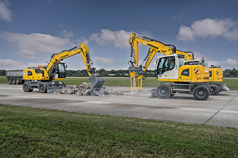 Die Mobilbagger von Liebherr sind vielfältig einsetzbar: Sei es wie hier auf dem Rollweg D1 des Hamburger Flughafens, im GaLaBau oder bei Einsätzen auf innerstädtischen Baustellen. Neben den klassischen Mobilbaggern bietet Liebherr mit seiner Compact-Variante eine große Vielfalt an Modellen für den jeweils entsprechenden Einsatz.