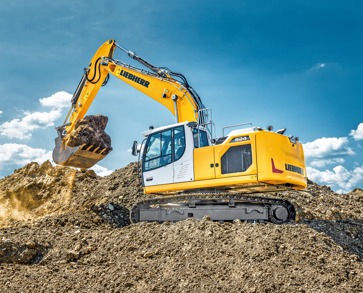 Ein Blick auf das aktuelle Baumaschinen-Portfolio mit Schwerpunktlegung auf das Segment der Erdbewegung verrät, dass Liebherr derzeit sowohl mit ausgereiften Maschinen als auch zukunftsweisenden Technologien aufwarten kann. Im Bereich der Raupenbagger sticht derzeit das Modell R 924 hervor: Es repräsentiert die mittlerweile achte Generation an »Arbeitstieren«, die eine außergewöhnliche Bandbreite an Einsatzmöglichkeiten abdecken. So verfügt der R 924 aus der 24-t-Klasse über einen für Liebherr entwickelten D 924 A7-05 FPT-4-Zylinder-Reihenmotor mit 129 kW Leistung bei 1 800 min¯¹. Der 4-Takt-Common-Rail-Diesel ist mit Turbolader samt Ladeluftkühlung und Abgasnachbehandlung Stufe V ausgestattet. Das verbaute Zweikreis-Hydrauliksystem ermöglicht hingegen eine maximale Fördermenge von 2 x 210 l/min bei einem Betriebsdruck von maximal 380 bar.