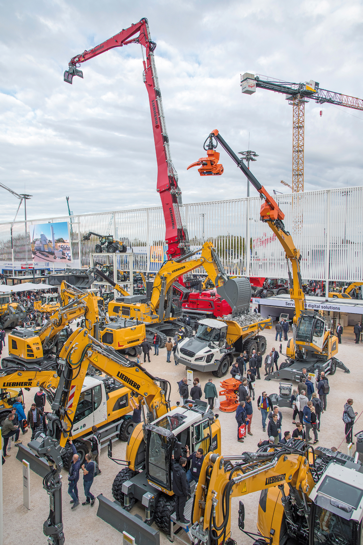 Für einen gehörig steifen Nacken sorgte wiederum der Raupenkran LR 1400 SX. Mit einer Gesamthöhe von 116 m war er das mit Abstand höchste Exponat am Liebherr-Stand. Dabei war der Kran anlässlich der Bauma nicht einmal mit der maximalen Auslegerlänge konfiguriert – wäre das der Fall gewesen, hätte er laut Liebherr beispielsweise Lasten auf den 170 m hohen Frankfurter Opernturm heben können. Für München war der LR 1400 SX mit einem 68 m langen Haupt- und einem 62 m langen Nadelausleger ausgerüstet. Mit seinem recht kompakten Transportgewicht von 46 t lässt sich der Kran zwischen den Baustellen bewegen. Die Podeste und Geländer bleiben während des Transports am Oberwagen montiert und müssen nur ein- oder ausgeklappt werden. Dank Selbstmontagesystem, so der Hersteller, lassen sich Auslegerstücke, Zentralballast, die Raupen und Hubwinden ohne Hilfskran montieren und demontieren. Sogar den rund 150 t schweren Heckballast kann der Kran eigenständig hydraulisch anheben, absenken und sichern.