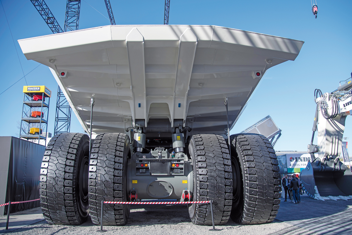 Ein schöner Rücken kann auch entzücken: Der elektrisch angetriebene Liebherr-Mining-Dumper T 274 E von hinten betrachtet.