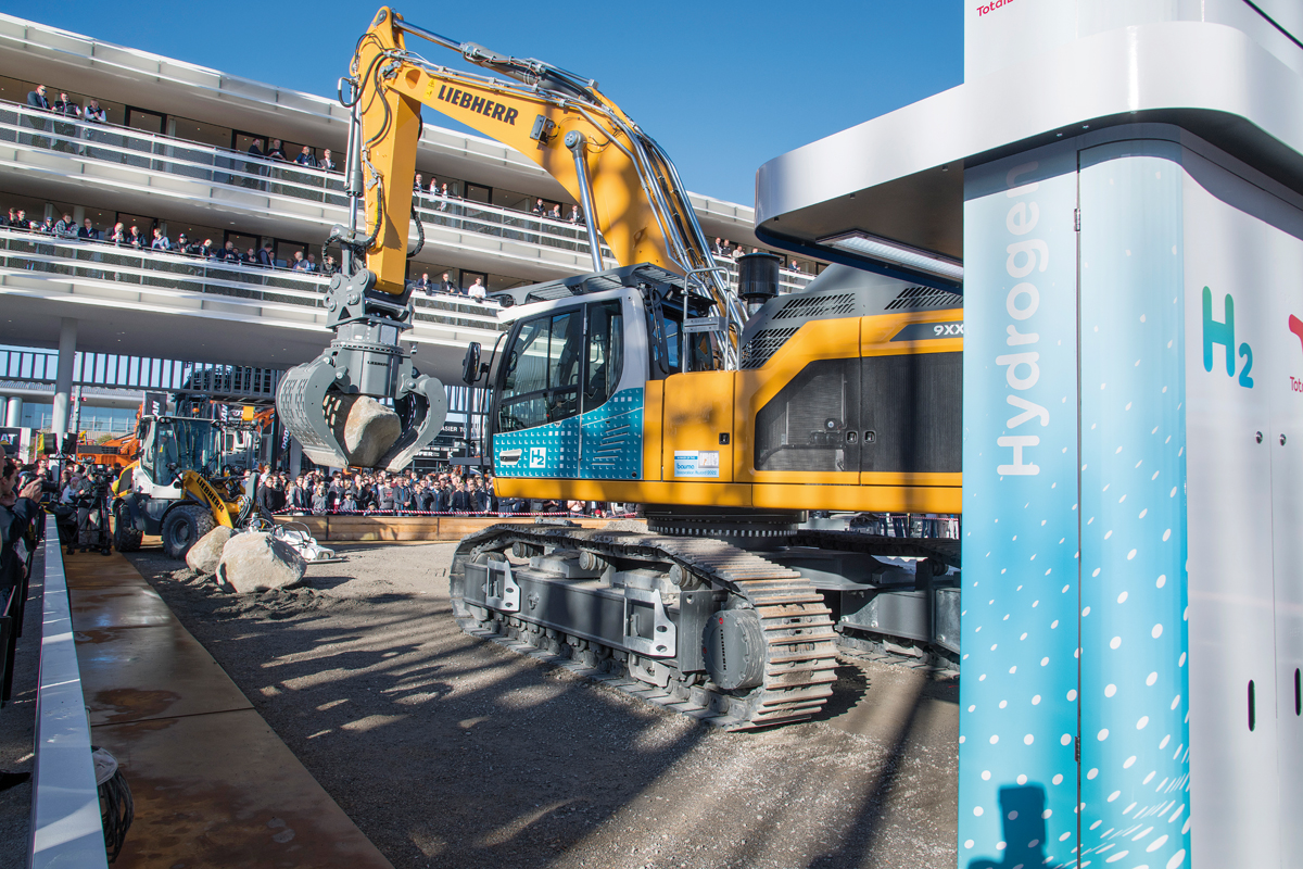 Als erster von einem Wasserstoffverbrennungsmotor angetriebene Liebherr-Bagger hat der R 9XX H2 auf der Bauma für viel Wirbel gesorgt. Um einen Beitrag zur Emissionsreduktion zu leisten und sich auch im Bereich der großen Baumaschinen zukunftssicher aufzustellen, hat Liebherr-France die Entwicklung dieses 50 t schweren Kolosses energisch vorangetrieben. Auf Konstruktionsbasis seiner 8. Generation an Raupenbaggern soll der Bagger seinen Fokus auf Effizienz und Komfort richten. Der R 9XX H2 erfüllt laut Hersteller die gleichen Leistungsdaten wie eine Ausführung mit Dieselmotor und soll als robuste Lösung für Erdbau- und Steinbruchanwendungen dienen. Der auffälligste Unterschied zu seinen Diesel-Pendants bleibt natürlich das Betanken: Für ein schnelles und sicheres Auffüllen soll eine Infrarotkommunikation zwischen Bagger und Tankstelle stattfinden. Henrik Weitze, Projektleiter bei Liebherr-France, hob in diesem Zusammenhang hervor, dass »die in Colmar erfolgten Tests ausgesprochen überzeugend« waren und diese Technologie viele Vorteile für die Zukunft verspricht.