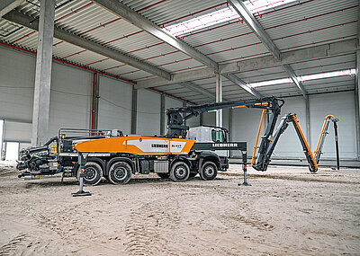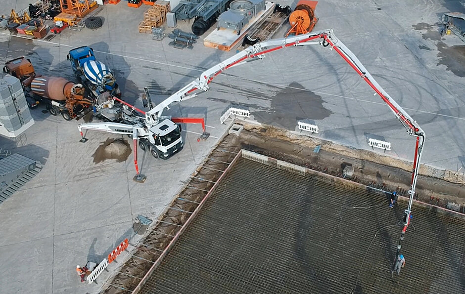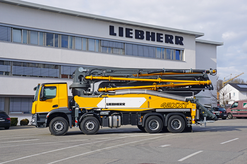 Um die hohe Qualität der Liebherr-Krane sicherzustellen, ist eine hoch tragfähige Testfläche notwendig. Hierfür wurde mithilfe der Autobetonpumpe 42 M5 XXT eine Prüfplatte, bestehend aus rund 750 m³ Beton gepumpt. Die kompletten Betonagearbeiten konnten innerhalb eines Arbeitstages abgeschlossen werden. Vor Ort war zusätzlich mit der 37 XXT noch eine weitere Autobetonpumpe aus dem Hause Liebherr.