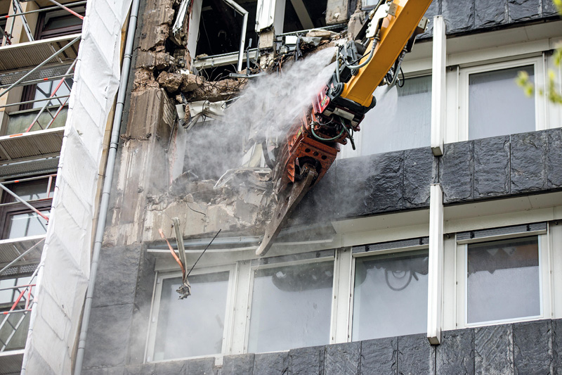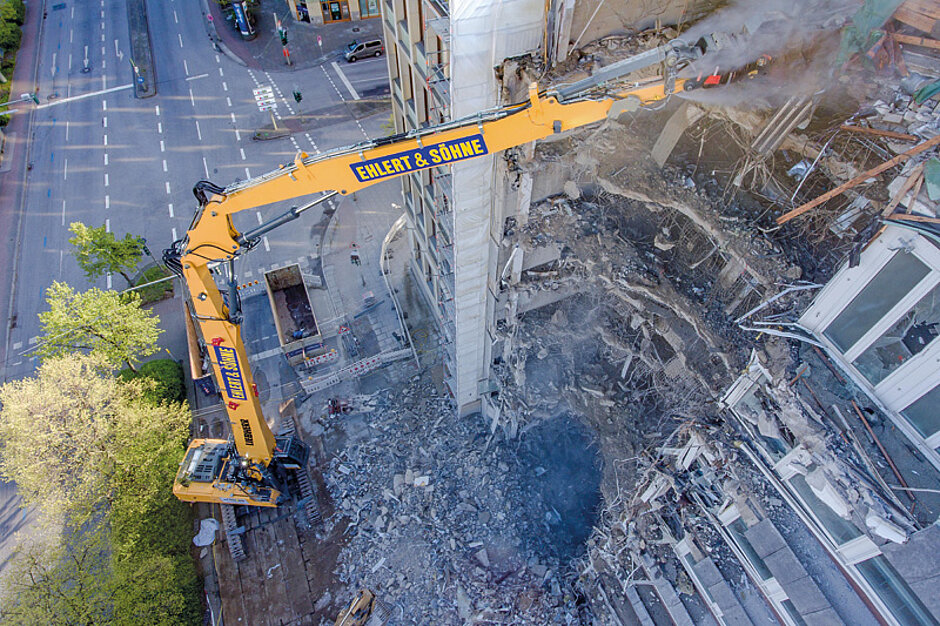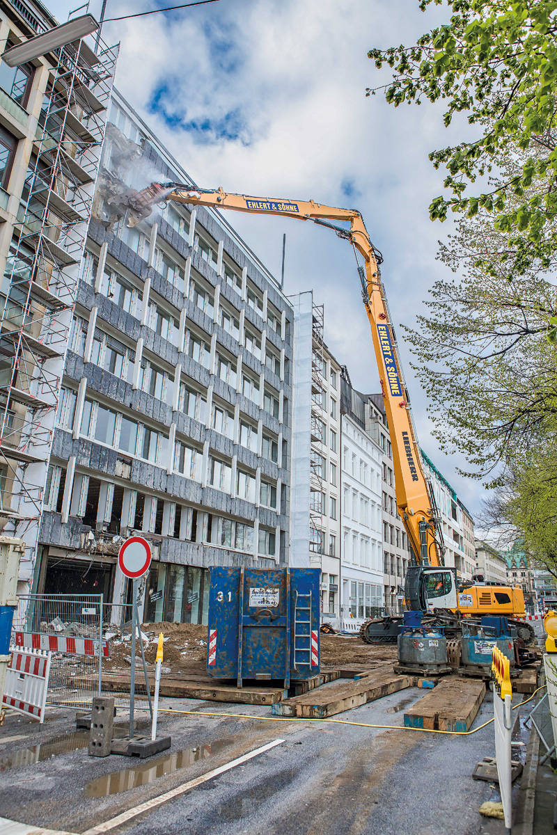 Im letzten April war Ehlert & Söhne mit dem Abbruch eines siebenstöckigen Gebäudes am Hamburger Ballindamm beauftragt. Auf dieser groß angelegten Baustelle setzte das Unternehmen den neuen Liebherr-Raupenbagger R 960 Abbruch ein. Innerhalb mehrerer Tage erfüllte dieser vollständig den ihm gestellten Auftrag. Nach über 1 000 produktiven Stunden seit dem ersten Einsatz zeigt man sich im Hause Ehlert & Söhne auch von der Robustheit der Maschine mit einem Einsatzgewicht von 90 t beeindruckt.