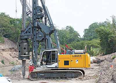 Der größere Baukran 154 EC-H 6 Litronic war bereits Ende August 2016 unmittelbar neben der Seebühne im Wasser auf sogenannten Piloten montiert worden. Diese Holzpfähle werden in den Grund des Bodensees gerammt und bilden das Fundament für den Kran. Der Unterwagen des Obendreherkrans wurde direkt auf die Piloten montiert. Der Kran war bis Ende April mit einer Hakenhöhe von 33 m im Einsatz. Er arbeitete mit einer maximalen Ausladung von 60 m und die maximale Tragfähigkeit beträgt 6 t. Wichtig beim Bühnenaufbau war das millimetergenaue Positionieren der Einzelteile. Dank des Feinpositioniermodus Micromove gelang dies perfekt.