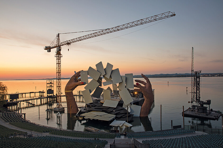 Die Aufbauarbeiten der Seebühne vor imposanter Naturkulisse begannen im Herbst vergangenen Jahres. Die Bühnenbildner setzten sowohl den 154 EC-H 6 Litronic als auch den 71 K für den Aufbau des 43 m breiten und 24 m hohen Bühnenbilds ein. Mithilfe der Krane bauten sie zwei überdimensionale Frauenhände aus je rund 190 Einzelteilen, ein Stahlgerüst sowie 59 Spielkarten zu einer eindrucksvollen Kulisse zusammen. Allein eine Karte ist 30 m² groß und wiegt rund 2,5 t.