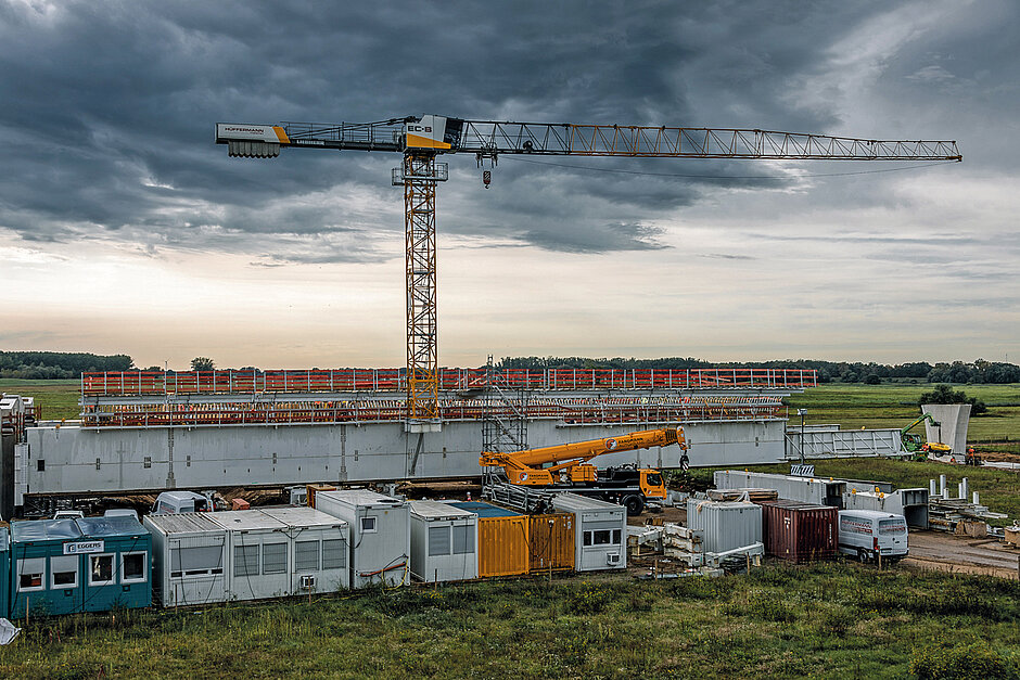 Der 125 EC-B 6 wird bei diesem Einsatz allerdings nicht in seiner Maximalgröße erscheinen: Der Kran kommt lediglich auf 16,5 m Hakenhöhe und eine Auslegerlänge von 42,5 m – ausreichend für diesen Einsatz, denn der Kran ist etwa auf gleicher Höhe wie die Brückenoberkante montiert und reicht rund 16 m über der Brücke in die Höhe.