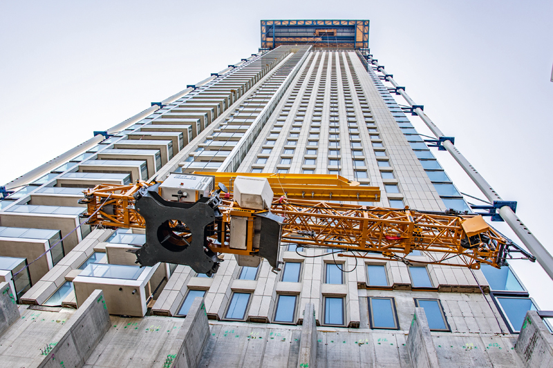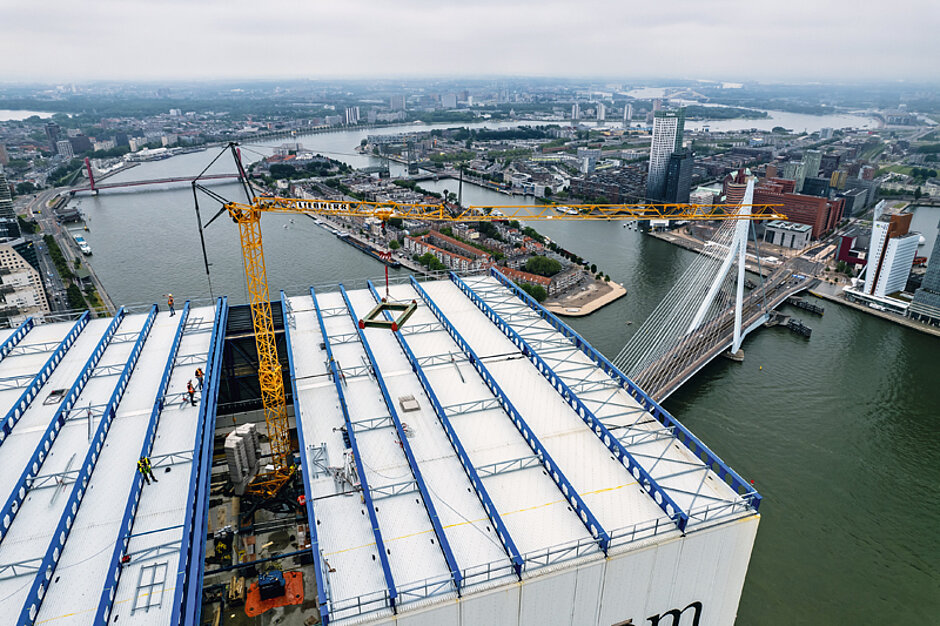 Dem 34 K lag die Hafenstadt Rotterdam mit ihrer einzigartigen Architekturszene zu Füßen – der Liebherr-Schnelleinsatzkran war kürzlich auf dem »Zalmhaven I«, einem der höchsten Wohntürme Europas, zugange. Seit November 2018 wird in unmittelbarer Nähe zur Erasmusbrücke gebaut. »De Zalmhaven« unterteilt sich in insgesamt drei Türme, wovon »Zalmhaven I« mit einer Höhe von 215 m der höchste sein wird. Die zwei weiteren Hochhäuser – »Zalmhaven II« und »Zalmhaven III« – sind identisch und messen eine Höhe von 70 m. Ein Entwurf der Architekten Dam und Partners und Kaan Architects sieht in dem entstehenden Viertel 452 Wohnungen, 33 Stadthäuser, ein Parkhaus, Büros, Gewerbeflächen, einen Dachgarten und ein Restaurant mit Blick auf die Rotterdamer Skyline vor. Die Fertigstellung ist für 2022 geplant.