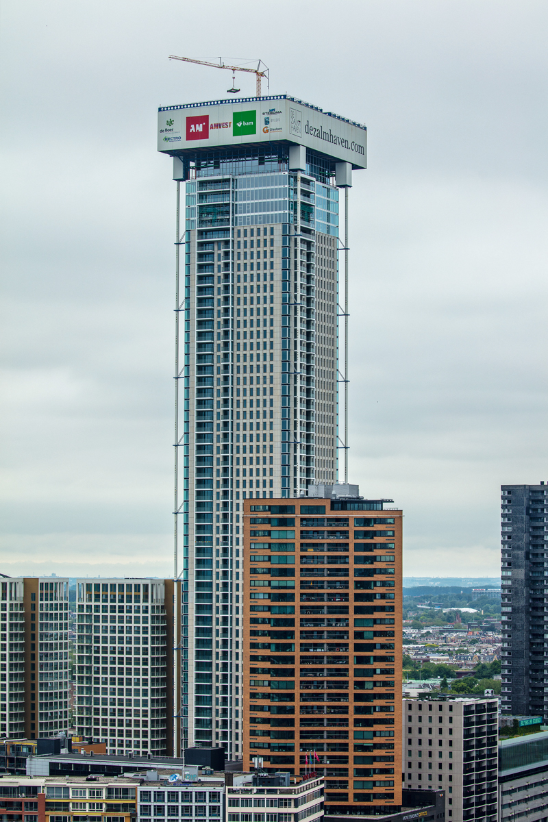 Auf dem Dach des künftigen Restaurants stand seit Mitte Juni ein Schnelleinsatzkran 34 K mit einer Hakenhöhe von 20 m. Seine Aufgabe in einer Höhe von 190 m war die Demontage eines Teils einer Hebebühne. Sie war für den Bau des »Zalmhaven I« benötigt worden. Die Hebebühne wuchs mit dem Turm Ebene um Ebene in die Höhe; quasi wie ein kletterndes Werk, in dem die Monteure so arbeiten konnten, als ob sie auf dem Boden stünden. Mit dem Konzept war die Baustelle am »Zalmhaven I« bislang ohne Turmdrehkran ausgekommen. Das hatte sich mit der Montage des 34 K, der via Funk gesteuert wurde, nun geändert.