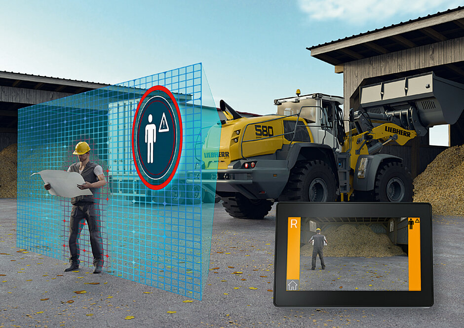 Zu Unfällen mit einem Radlader kommt es häufig, wenn der Maschinenführer nach einem Ladevorgang zurücksetzt, besonders wenn sich Personen im Arbeitsbereich des Radladers befinden. Für größtmögliche Sicherheit entwickelt Liebherr seine Assistenzsysteme laufend weiter. Ein aktuelles Beispiel ist die aktive Personenerkennung heckseitig, bei der jetzt eine unterstützende Bremsfunktion sowie eine Gefahrenkarte integriert sind. Die aktive Personenerkennung beispielsweise warnt Maschinenführer optisch am Display sowie mit akustischen Signalen vor Gefahren im Heckbereich des Radladers. Für eine gezielte Warnung vor einem drohenden Personenschaden unterscheidet das Assistenzsystem mithilfe von intelligenter Sensorik selbstständig zwischen Personen und Objekten.