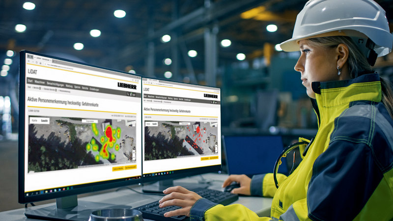 Neben dem Bremsassistenten ist die Gefahrenkarte eine zweite neue Funktion für die aktive Personenerkennung heckseitig. Jedes Mal, wenn das Assistenzsystem eine Gefahr erkennt und ein Warnsignal ausgibt, überträgt es ein GPS-Signal an das Liebherr-eigene Datenübertragungs- und Ortungssystem LiDAT. Darauf aufbauend stellt Liebherr für jeden Betreiber eines Radladers mit aktiver Personenerkennung in LiDAT eine Google-Maps-Karte mit diesen GPS-Punkten zur Verfügung.