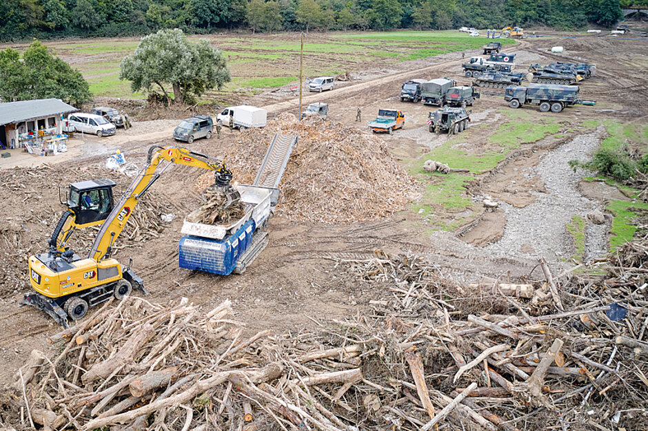 Kockmann-Firmenchef Martin Brinkschmidt war im Krisengebiet mit dem mobilen Schredder Urraco 95DK, um zu helfen. »Wir haben uns der Treibholzberge angenommen. Die Firma Lindner hat uns extra zwei Monteure vor Ort geschickt, um das leistungsstarke und robuste Zwei-Wellen-Schnittsystem LW-10.10, das speziell auch für sperriges Altholz geeignet ist, einzubauen«, berichtet Brinkschmidt.