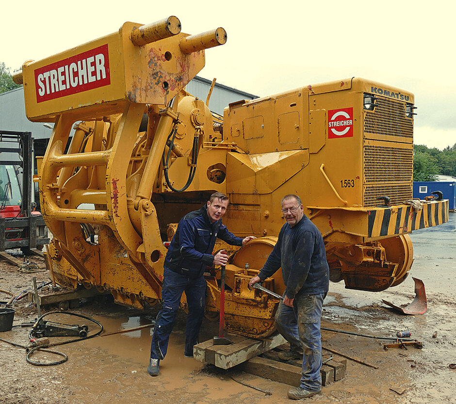 Die Rohrverlegeraupe gehört der Streicher Unternehmensgruppe. Der Austausch des Laufwerks wurde in Ölsnitz im Vogtland durchgeführt. Getauscht wurden zwei ölgeschmierte Kettenbänder mit 42 Gliedern, vier Tragrollen, 14 Laufrollen, zwei Segmentgruppen und zwei Leiträder. Die 95 cm breiten asymmetrischen Bodenplatten konnten weiterverwendet werden. Die festgesetzte Verschraubung musste allerdings abgebrannt werden. »Wir haben als Servicebetrieb für uns die Firma Schweißtechnik N & K Baumaschinen aus Unna gewonnen. Sie führt alle diese Austauscharbeiten und auch andere Reparaturen für uns durch«, erklärt Henke. Um die großvolumigen und schweren Austauschteile auch gut handhaben zu können, war ein Gabelstapler zur Unterstützung im Einsatz. Zügig gingen die Arbeiten voran und innerhalb von zwei Tagen war der komplette Laufwerkswechsel vollzogen.