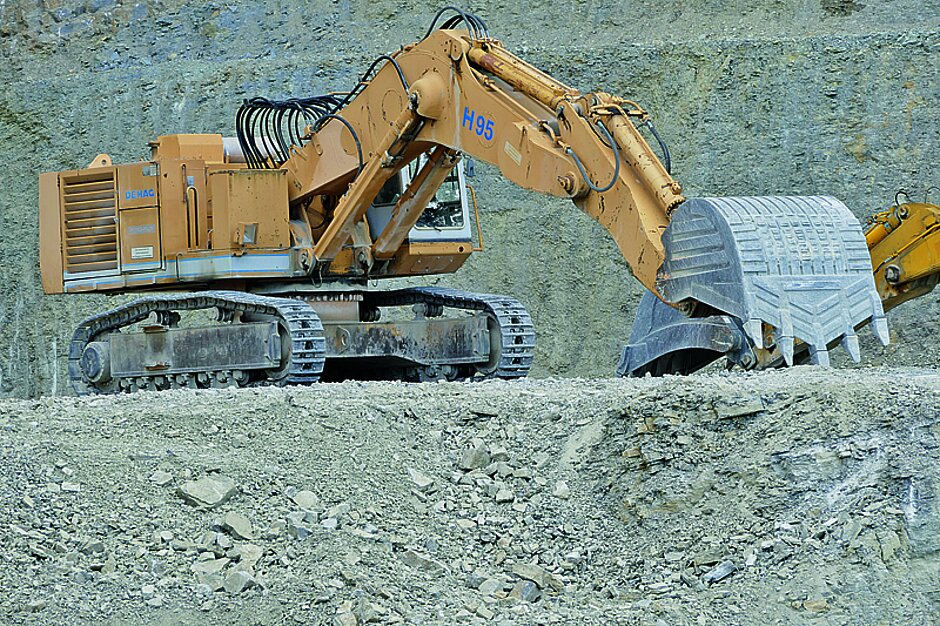 Die großen LIS-Zähne beißen sich im nahe dem hessischen Sontra gelegenen Steinbruch Röhrd zügig in das Kalkgestein, am Löffel des 105-t-Modells H95 von Demag sind einige Cat-J700-Felslader-Zähne als Ersatzausrüstung montiert. Wie es für die komplexe Aufgabe notwendig ist, sind diese 415 mm lang und aus äußerst verschleißfestem Material hergestellt. Auch die Geometrie entspricht den Anforderungen: Das Eindringen in den Fels wird durch die auf hartes Gestein hin optimierte Form der Zähne bestmöglich unterstützt. Im Steinbruch wird helles, graues Kalkgestein mit einer Härte von 3 auf der Mohs’schen Skala gewonnen, gilt also als mittelhart. Diese Skala reicht von 1 bis 10, den Härtegrad 10 weisen Diamanten auf.