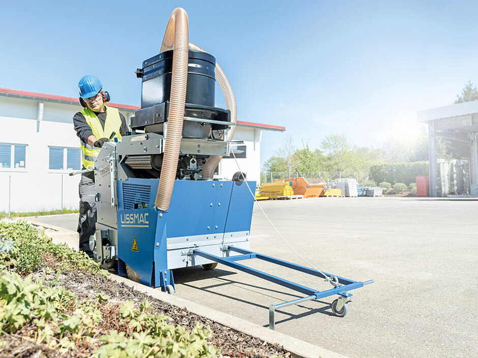 Die Herstellung von wand- und bordsteinbündigen Fugen erledigt der Compactcut 900 P/T durch ein senkrechtes Schneiden, wie es die ZTV Fug vorschreibt. Möglich macht das laut Lissmac die speziell geformte Absaughaube, ein zentrales Bauteil der integrierten Trockenabsaugung Vacuum-Dry 100. Das geschlossene Absaugsystem steht für staubfreies Trockenschneiden, was nicht nur Zeit spart, sondern auch den Arbeitsschutz des Bedieners und des gesamten Teams auf der Baustelle fördert. Als ebenfalls anwenderfreundlich gelten das übersichtlich gestaltete Bedienpult sowie die höhenverstellbaren Handgriffe. Mit einem feinfühligen Fahrhebel wird der Hydrostat angesteuert, der eine gleichmäßige, kontrollierte Maschinenführung gewährleistet. Das griffgünstig platzierte Lenkrad unterstützt sowohl zentimetergenaues Korrigieren beim Schneiden als auch flotte Richtungswechsel und zügige Umsetzmanöver.