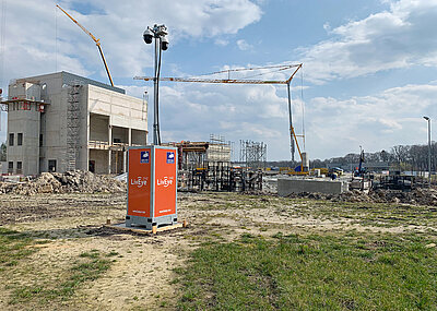 Der Videoturm »OnePlus« überzeugt mit moderner Überwachungstechnik auf lediglich 1 m2 Standfläche: Zwei PTZ- und eine bispektrale Bullet-Kamera thronen auf einem 6 m hohen Mast und detektieren Eindringlinge auf bis zu 200 m Entfernung. Das System kann Verdächtige bei Bedarf im 360°-Winkel verfolgen. Passanten verpixelt die Kamera DSGVO-konform. Zum Laufen benötigt das System lediglich eine 230-V-Stromversorgung; fällt der Strom aus, liefert ein Batteriespeicher bis zu 80 Stunden weiter Energie.