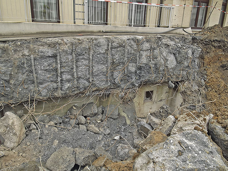 Nach einigen Gesprächen mit Bau-Haag begannen die Laarakkers-Mitarbeiter mit zehn Versuchsbohrungen Ø 40 m/m. Die Bohrungen wurden dann, in Abständen von 0,3 m bis 0,5 m und Bohrtiefen von ca. 1,8 m bis 1,9 m gebohrt. Einen Tag nach dem Verfüllen der Versuchsbohrungen konnten aufgrund des gerissenen Betons dann die Lochabstände für den Abbruch der Bunkerdecke mit Betonamit festgelegt werden. Die Bohrungen wurden wie bei den meisten Abbrucharbeiten mit Betonamit am Tag gebohrt und vor Feierabend mit Betonamit verfüllt. Während die Spezialisten von Laarakkers in den Feierabend gingen, arbeitete das Betonamit über Nacht und zeigte morgens das gewünschte Ergebnis. Mit Geräten konnten dann die gebrochenen Teile der Betondecke gelöst und im Anschluss neue Bohrungen für den nächsten Abbruchabschnitt erstellt werden. Dieser Vorgang wurde so lange wiederholt, bis die Betondecke zerstört war. Im Anschluss war es möglich, mittels Betonzange und ohne Erschütterung die bei weitem nicht so starken Bunkerwände abzubrechen.