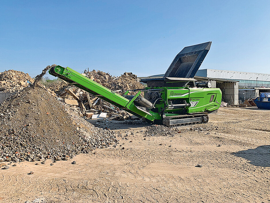 Die Standzeit liegt laut M+R abhängig vom Material zwischen 300 und 500 Betriebsstunden – bei einer Produktionsleistung von etwa 130 bis 150 t/h und einer Ausgangskörnung mit 45 – 50 mm. Wird die Verschleißgrenze erreicht, können die Wellen getauscht oder neu aufgeschweißt werden. Neben dem Schredder-Modell führt Franzoi auch einen 32-t-Backenbrecher und weitere Recycling-Maschinen in seinem Sortiment. t
